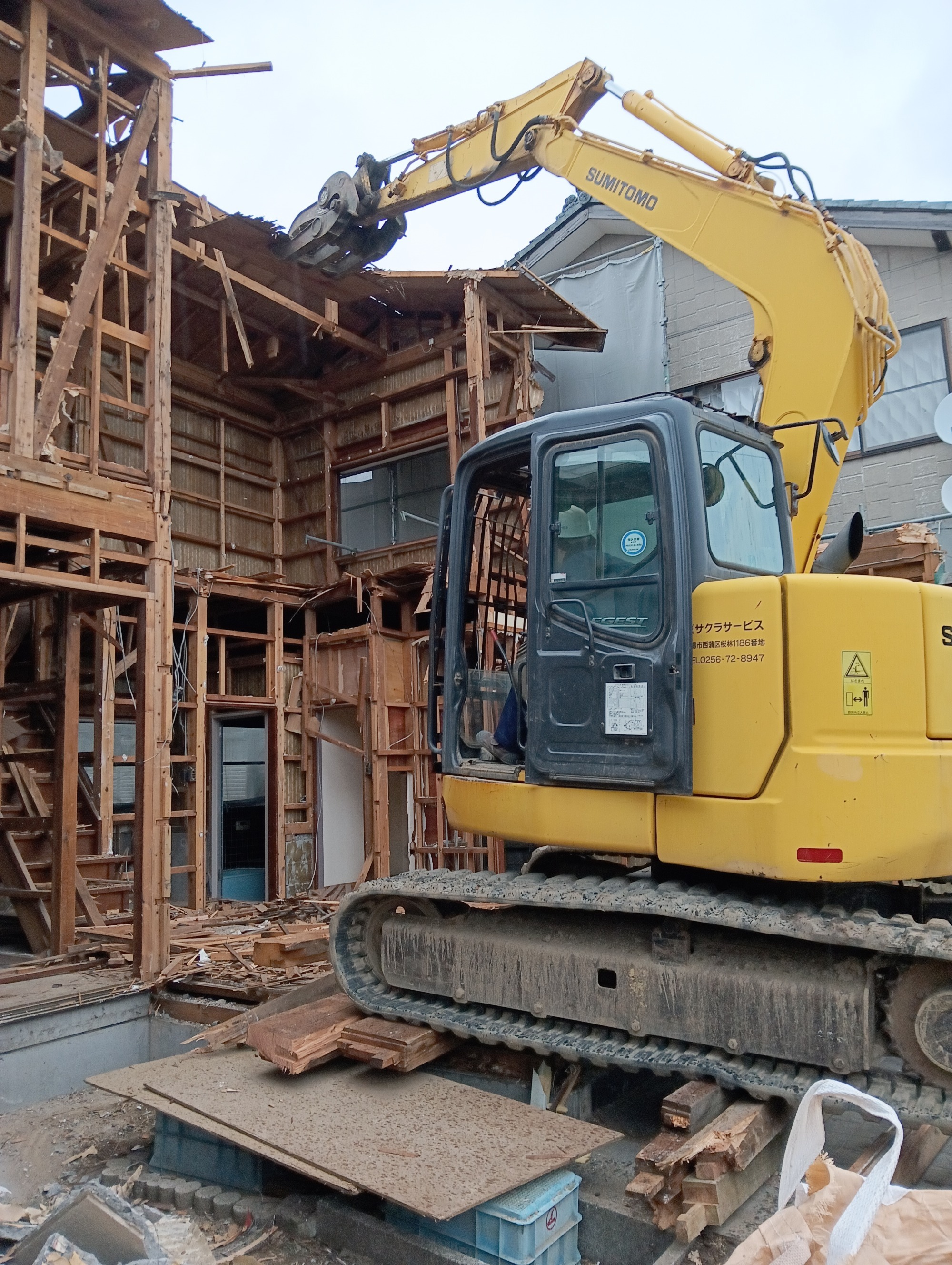 木造家屋解体:重機で屋根など撤去します。